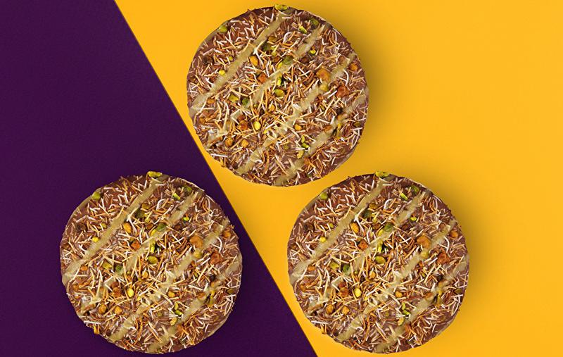 Состав: Набор из трех Дубайских пончиков с начинкой из фисташковой пасты и теста катаифи декорированный молочным шоколадом и фисташками