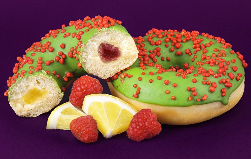 Состав: Пончик с двойной начинкой - лимонной и малиновой, декорированный зеленой глазурью и красной посыпкой.