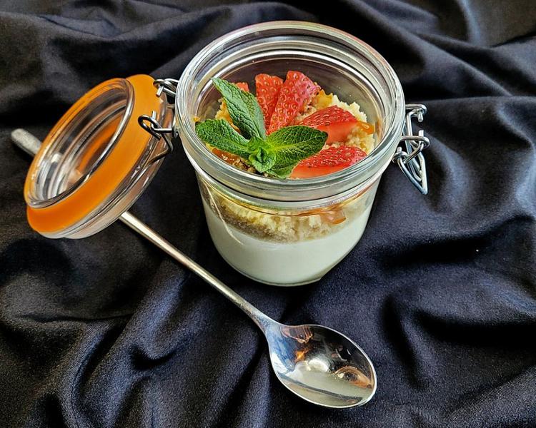 Состав: Заварной ванильный крем, с крошкой песочного печенья, карамельного соуса и клубникой.