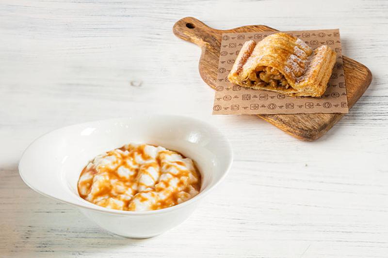 Нежная рисовая каша на молоке, штрудель из хрустящего слоеного теста с пряной начинкой из сладких карамелизированных яблок и изюма