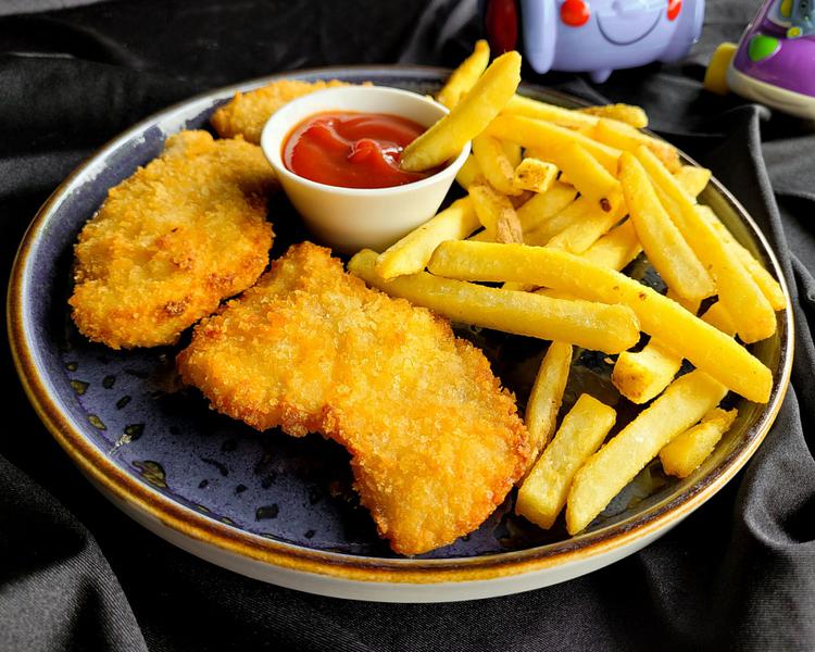 Состав: Жареные куриные кусочки в панировке, подаются с картофелем фри и кетчупом