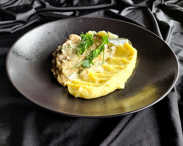 Состав: Фермерская говяжья вырезка в сливках с шампиньонами и луком. Подается с картофельным пюре и соленым бочковым огурчиком.
