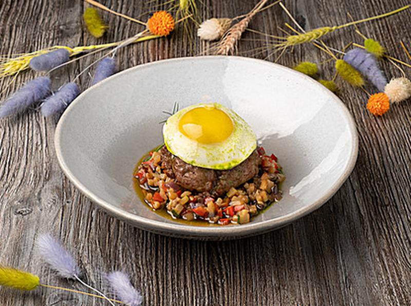 Состав: Рубленая котлета (из нашего бычка), подается с овощным рататуем (баклажаны, перец болгарский, красный лук, сельдерей, томатный соус) и украшается глазуньей и кинзой.