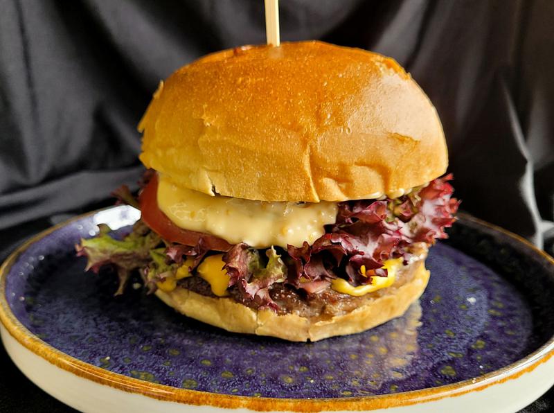 Состав: Настоящий фермерский бургер. Булочка бриошь, котлета из мраморного мяса нашего бычка с сыром чеддер, листья салата, хрустящие соленые огурчики, ялтинский лук, бакинские томаты, медово-горчичный соус и соус барбекю.