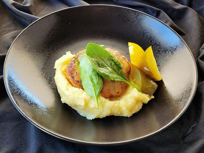 Состав: Котлеты, собственного приготовления, из куриного бедра, лука и сливок. В порции 2 котлеты. Подаются с картофельным пюре и соленым огурчиком.