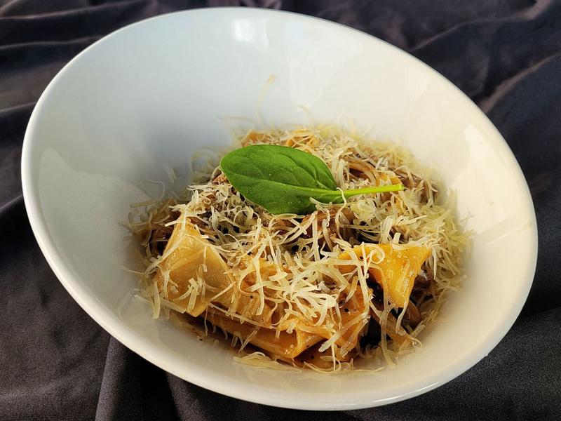 Состав: Макароны паппарделле с томленой говядиной,репчатым луком,шампиньонами в соусе демигляс. Украшается сыром пармезан.