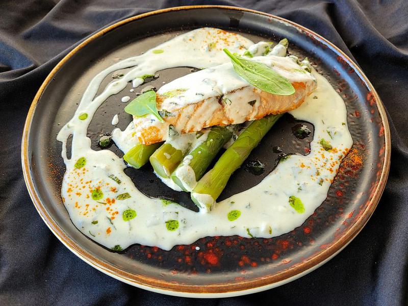 Состав: Жареный стейк из форели, подается на бланшированной спарже под соусом берблан
