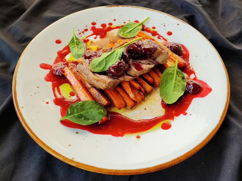 Состав: Обжаренное филе утки прожарки медиум подается с запеченной морковью в медовой глазировке с карри и коньячным соусом с вишней
