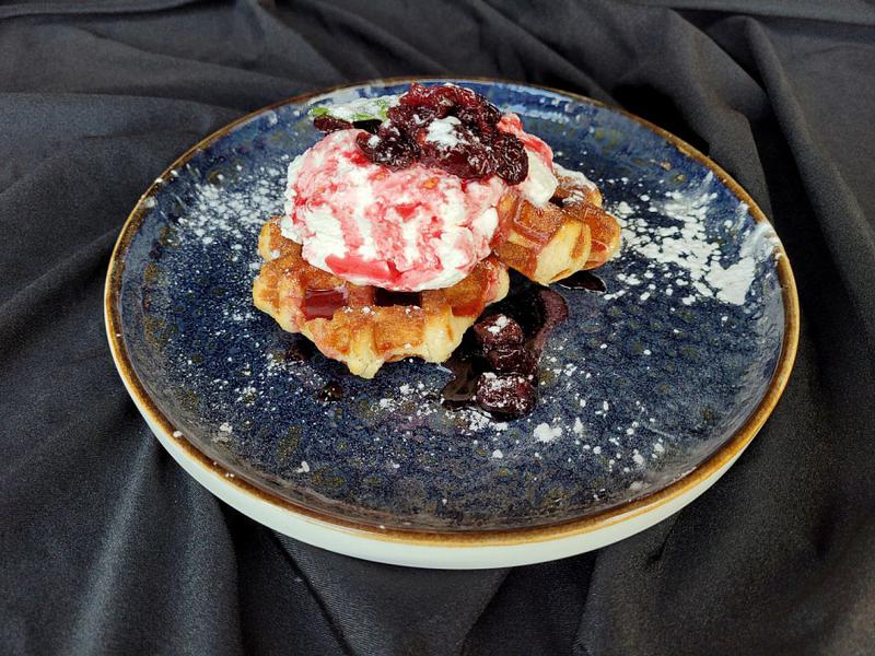 Состав: Сладкие вафли с хрустящей корочкой, подаются с ванильным кремом и вишневым вареньем