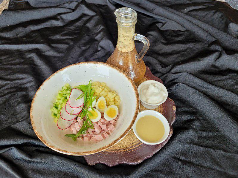 Состав: Начинка: ветчина, картофель, огурец, редис, перепелиные яйца, зеленый лук. Отдельно подается также сметана и соус на основе хрена, горчицы и уксуса