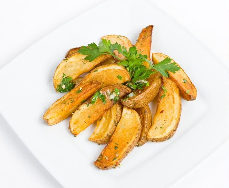 Состав: Молодой картофель порезанный дольками с ароматными специями. Жареный картофель, чеснок, зелень, соленый перец.