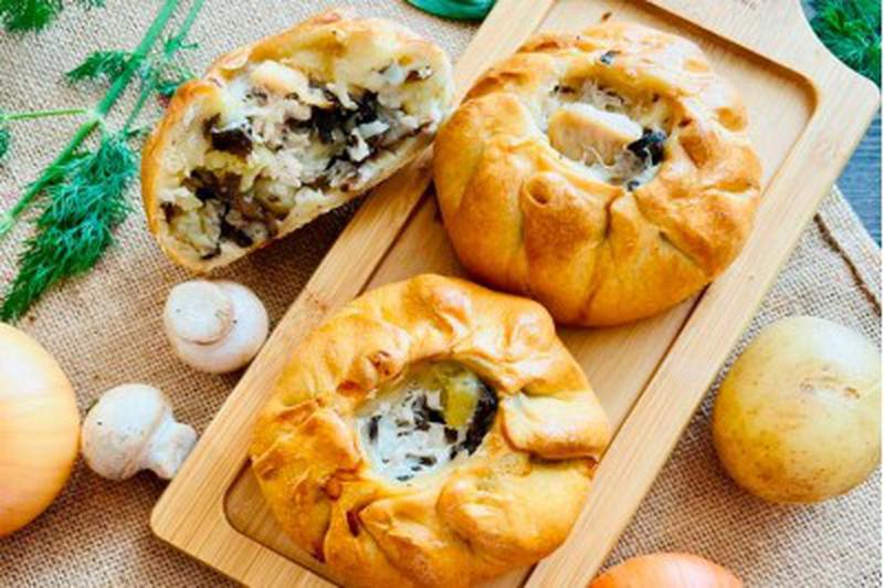 Состав: Кусочки курицы, картошка, шампиньоны, обжаренный лук, специи, куриный бульон, тесто сдобное бездрожжевое