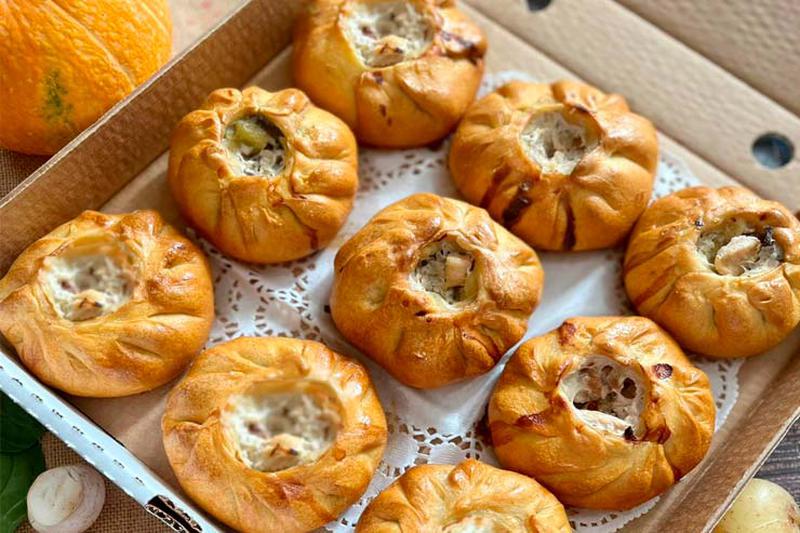 Состав: Балиш с курицей и луком - 3 шт, балиш с курицей картошкой и грибами - 3 шт, балиш с курицей картошкой и луком - 3 шт.