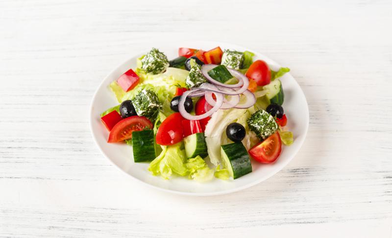 Состав: салат айсберг, томаты черри, огурцы свежие, перец свежий, сыр фетакса, лук красный, масло оливковое, маслины консервированные, зелень укропа, соль, специи.