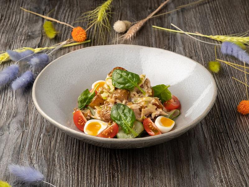 Состав: Филе форели горячего копчения, запеченный с травами бейби-картофель, перепелиное яйцо, микс салата, медово-горчичная заправка, черри