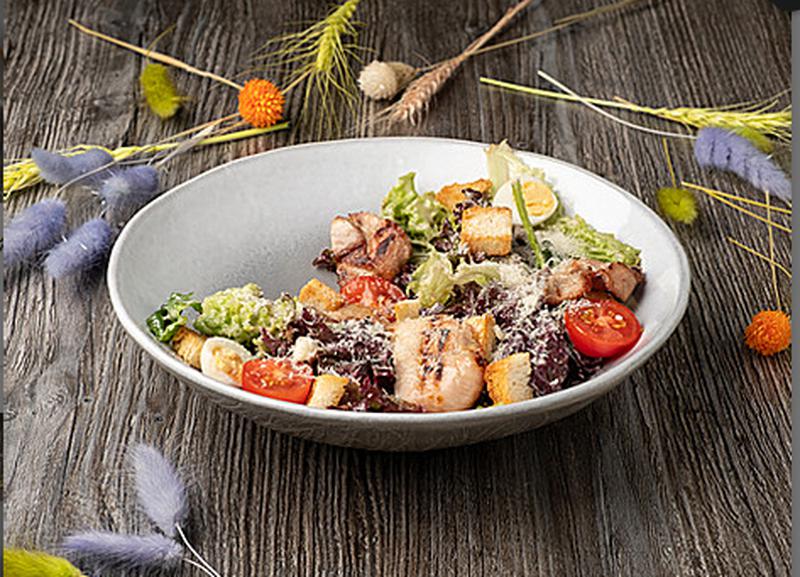 Состав: Не совсем классический цезарь, вместо ромейна и айсберга - наш микс салата, с помидорами черри, пармезаном, перепелиным яйцом, гренками из тостового хлеба и соусом цезарь.