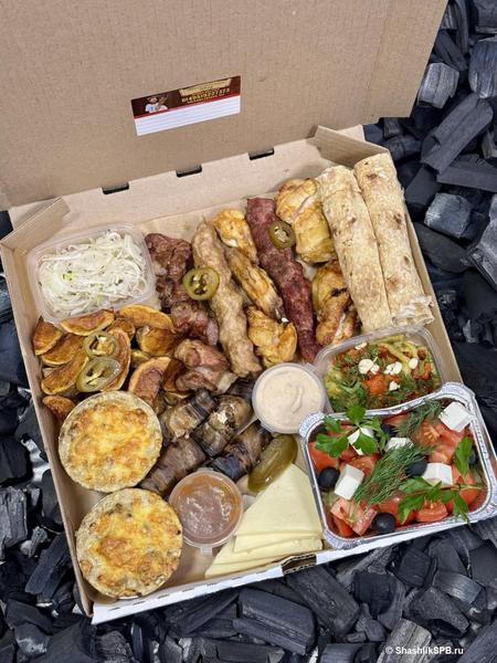 Состав: Шея 100 гр, люля телятина 100 гр, люля индейка 100 гр, крылья 100 гр , ш-к кура 100 гр, Жюльен 1 порция (200 гр), Баклажановые рулетики 4 шт, Салат Греческий 200 гр, Айдахо 200 гр, Перец на мангале с чесноком 100 гр, Сыр Сулугуни 100 гр, Лаваш 2 порции, Зелень 50 гр, Соусы : фирменный, чесночный