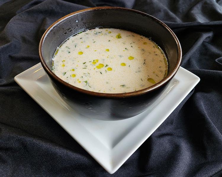Состав: Финская сливочная уха с форелью, томатами черри, картофелем и морковью. Украшается зеленым маслом.