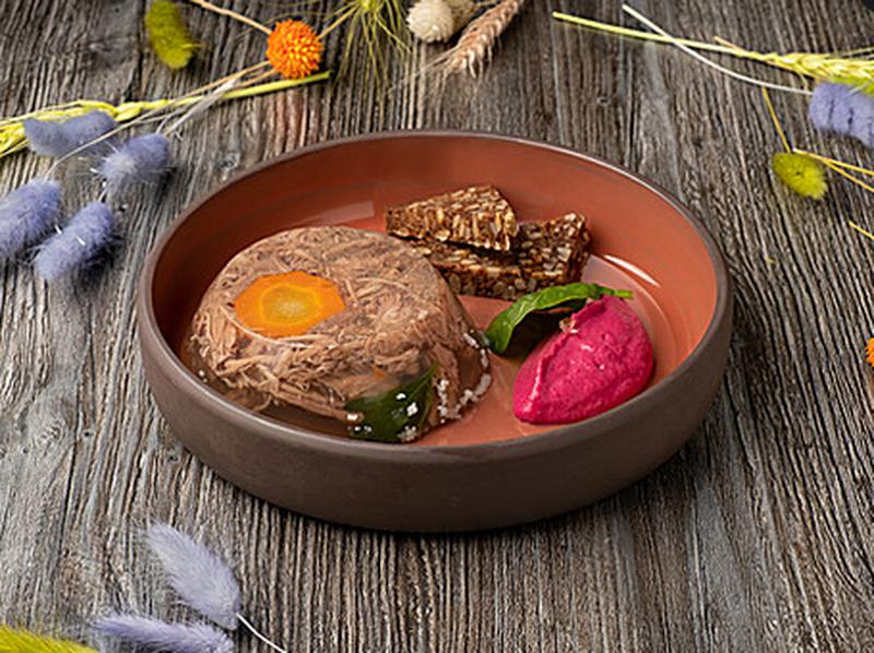 Состав: Холодец приготовлен по домашнему рецепту, из говядины. Подается с муссом из свеклы и хрена и пожаренным кусочком хлеба.