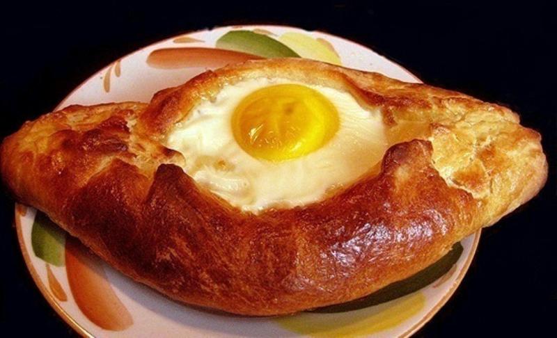 Состав: Лодочка из пышного сдобного теста с сыром сулугуни, имеретинским сыром и сырым яйцом. Дрожжи, маргарин, масло сливочное, молоко, сахар, соль, яйцо.