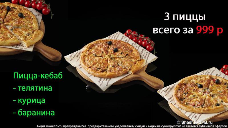 Состав: В данный набор входит 3 пиццы: пицца-кебаб из телятины, пицца-кебаб из курицы, пицца-кебаб из баранины. Данная позиция является АКЦИОННОЙ. При добавлении данной позиции в чек скидка на День Рождения, Самовывоз и иные акционные предложения не действуют.